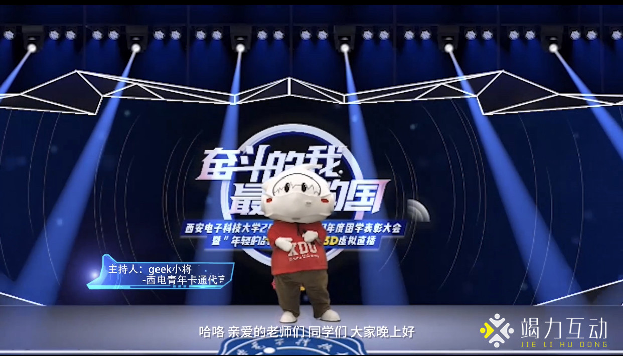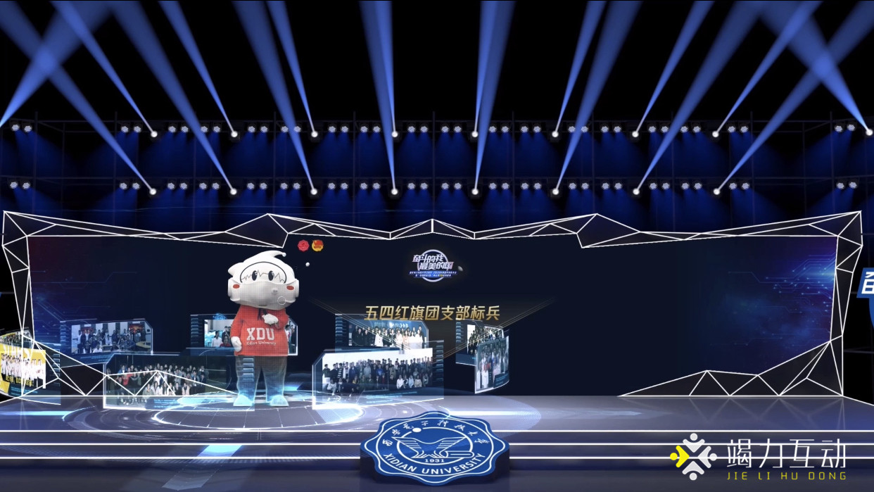 2020年4月28日,西安电子科技大学举行线上年度表彰大会颁奖典礼暨“年轻的战场”青云聚3D虚拟直播,典礼采用绿3D幕虚拟直播,并使用卡通IP等特色形式播出,在线观看人次数破百万。鼓励西电青年不断奋斗贡献祖国。